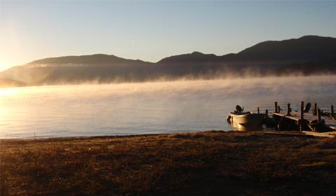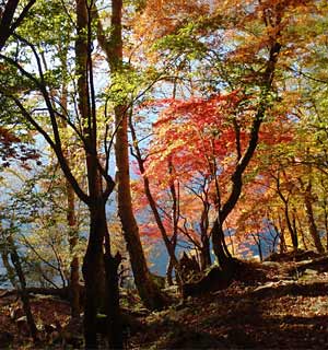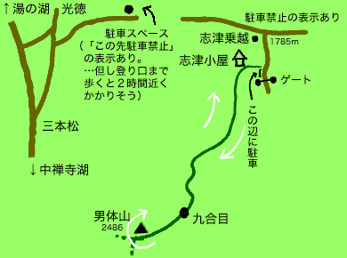 ↑雲が切れた九合目から湯の湖方面の展望。 |
