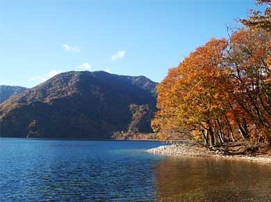 林道を戻って、光徳牧場わきの光徳沼から見た男体山→。 |