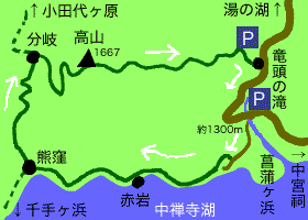 ![]() ↑だいぶ下りた所から見上げる山頂。ミズナラなどの林の穏やかな道を下ると竜頭の滝↑に出ます。ここはいつも観光客でこみあう所で、紅葉の最盛期とあってだいぶ賑やかでした。 歩行時間は3時間半ほど |