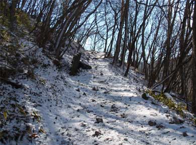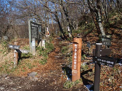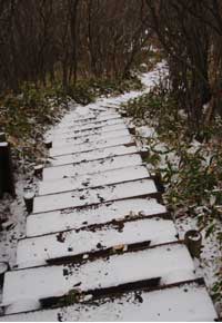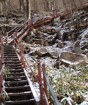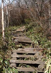 噴火口(大沼)の縁にあたる山なのでけっこう急坂で、夏には登る人が多いための崩れ止めでしょうか、木材の階段が続き、鉄の階段↑も出てきます。