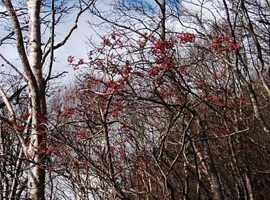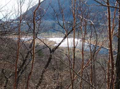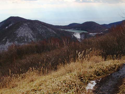 ↑葉を落とした林の中を登ります。 覚満淵(かくまんぶち)という小型の高層湿原↑。