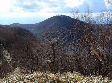 斜面を登って尾根上に出るともう一つの噴火口「小沼」が見えます↑。小沼の左は長七郎山。