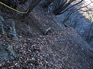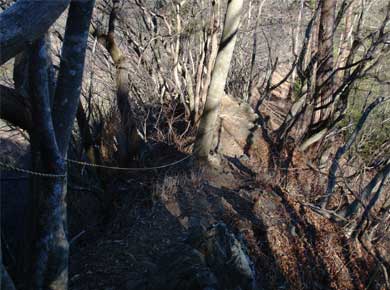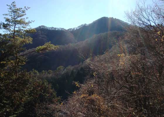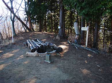 九鬼山という名前のいわれはわかりませんが、近くの百蔵(ももくら)山の桃太郎が、旧甲州街道犬目宿の犬と鳥沢の鳥、猿橋の猿を連れて九鬼山の鬼退治をしたという、山梨ではかなり有名な語呂合わせの伝説があります。←山頂に近くなって右手に分かれ道があり、展望が良いとの表示で立ち寄った天狗岩(中央下)からの眺め。 特に今までと変わった展望ではなかったようです。 |