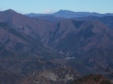 天狗岩からの御正体山と富士山→。↓はそこからの、隣の高川山。 高さは九鬼山と同じくらいですが、中央線の駅から登れて展望がよいということで、人気があるようです。 ▼の山の両脇に南アルプスの雪山(右は北岳?)が見えました。 |