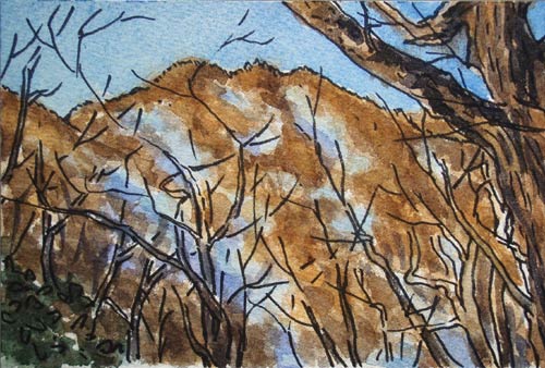 ↑大沢山。山頂らしくない感じですが、このあと回り込むように下りた道から見ると、きれいな三角形に見えました。ここを過ぎると高尾山まで続く笹尾根との分岐点があり↑、こちらは日当たりがよく暖かいせいか雪も消えて、常緑樹のアセビが多く見られます。