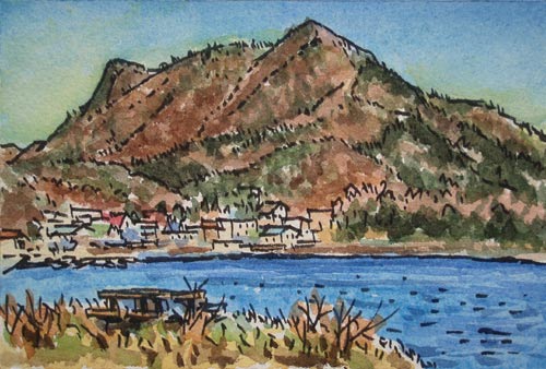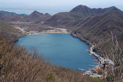↑湖畔の国民宿舎榛名荘(目立つ建物の後)わきから林にはいり、すぐ上の硯岩(すずりいわ↑中央)に向かいます。