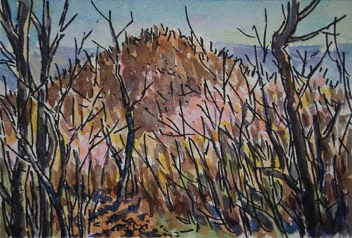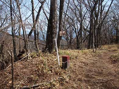 杏ヶ岳へ向かう笹の斜面から振り返る山頂↓。