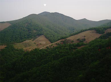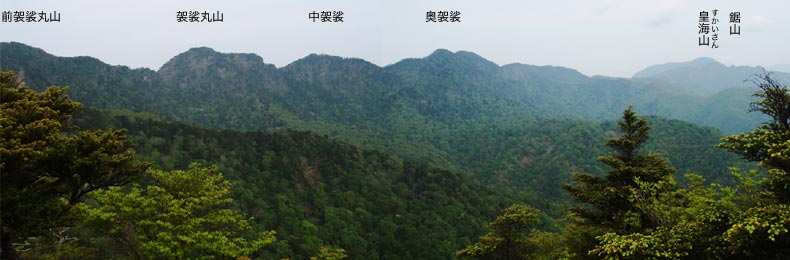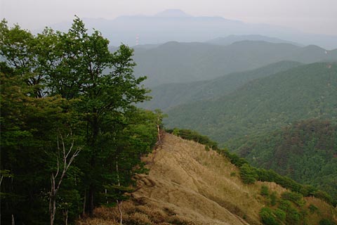 ひと汗かいたころ樹林が切れて前袈裟丸山らしい山頂が見えました(下右の▽)。