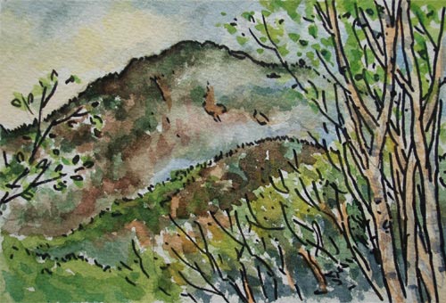 ↓支尾根の道から西側の眺め。遠い山は赤城山のようです。急な斜面を階段状に流れる沢↓。