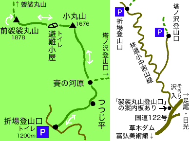 ![]() ↑小丸山を下りると尾根上の平地に鉄板の避難小屋があります。↑はその内部。小屋の右側にトイレがあり、左手の山腹を五分ほど下りると水場もあるそうです。 |