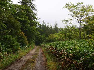 しばらく林道↑を歩くと、林道の急斜面迂回部分を登山道が直登する「林道時々登山道」といった形になります(←)。