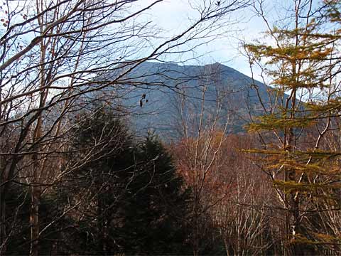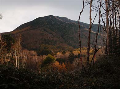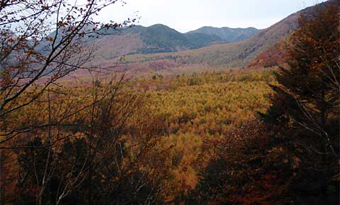 時々林が切れて、広大なすそ野の落葉松林↓や、男体山、大真名子山(おおまなごやま↑)などが見えます。
