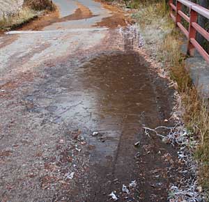 その日の夜のニュースでは奥日光で初氷を観測したと聞きましたが、翌日、この林道でも水たまりに氷が張っていました(右上)。