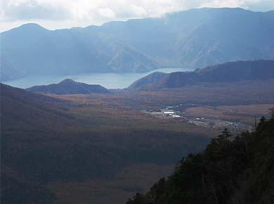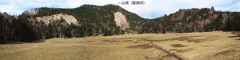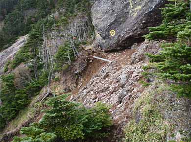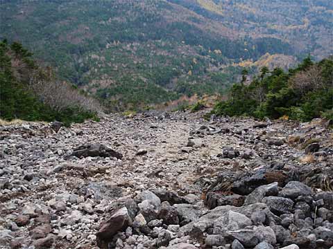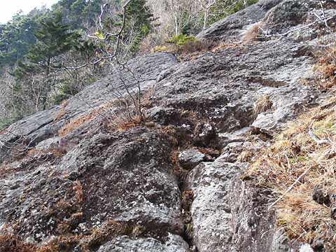 ここから山頂下までは針葉樹林内の道で、ほとんど展望は無く、今は花も紅葉もありませんが、シャクナゲが多いので6月頃に登るのがよさそうです↑。←時々、林の隙間から男体山などが見えます。 直線的で急な登り道は、雨などの流水に削られるのか溝のようで、削り残された木の根や岩が大きな段差を作っていて、荒れて歩きにくい感じです(下)。 |