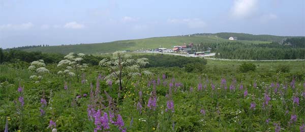 ↑白樺湖から上って霧ヶ峰の入口あたりからの眺め。白樺湖を見下ろす眺め。山は蓼科山(たてしなやま)→ ↓沢渡(さわたり)方面に少し上った所からの、出発点の強清水(こわしみず/霧ヶ峰インターチェンジ)方面の眺め。この辺の丘は散策路になっています。 群がった白い花はシシウド、紫色のはヤナギランの花。 |
