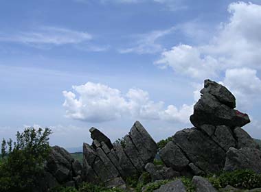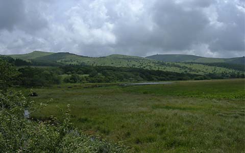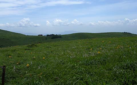 八島湿原と鷲ヶ峰。八島方面への車の通れる道の少し上に、平行して細い山道があり、花が多くて気持ちのいい道だったのですが、この先が林の伐採で途切れていました。 |