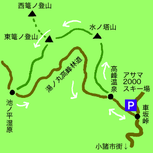 ←池ノ平湿原に出ます。湿原は何万年か前の噴火口の跡だそうで、高さ 2000m ほどですが 3000m 級の高山植物が見られるということです。 水ノ塔山と篭ノ登山の南斜面を巻いて通る「湯ノ丸高峰林道」の高さが 2000m 近くあり、道から山頂までは 200m 余りで、池ノ平から篭ノ登山へは1時間半程で往復できるため夏場はだいぶ賑わうようです。 今は林道は冬季閉鎖中で、この辺も静まりかえっています。 |
