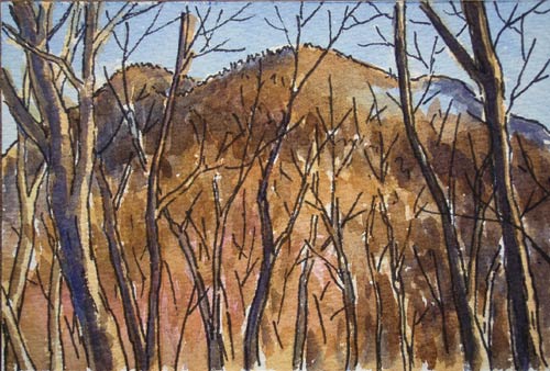 御前山は手頃なハイキングコースで、カタクリの名所でもあるので、四月下旬から五月上旬は山歩きに慣れない人も多いために「おしゃべり」の看板があるのでしょうか。実際に転落した人があったのかも知れません。 これまた二十数年前のカタクリのスケッチです→。 これは惣岳山で描いたようです。 ↓惣岳山山頂。 下右は御前山に向かう下り道。 植物保護のロープが張られていますが、カタクリを描いた頃はこれほど厳重ではなかったようです。 |