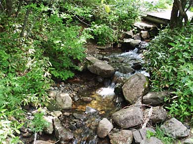 遊歩道から見る出発点の強清水(こわしみず)あたり→。