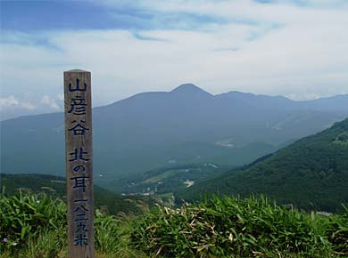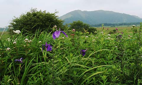 ↑八島ヶ原と鷲ヶ峰。アヤメのような花はノハナショウブ。