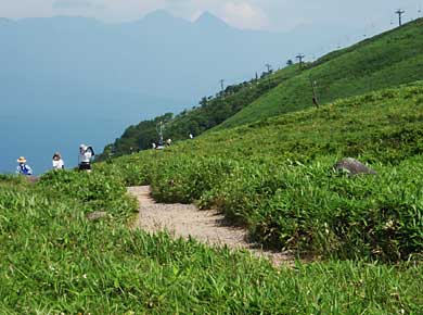 ↑キバナノヤマオダマキ(黄花の山苧環)。 ↑男女倉山(おめくらやま/ゼブラ山)。昔、この山の北麓の集落で子供が少なくなったため、若い男女をむりやり倉に閉じこめて子供を生ませた事があって「男女倉」という集落名になったのだとか。 ウスユキソウ(薄雪草)↑ |