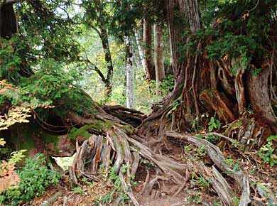 台地に出るまでは樹林の中を登りますが、町に近い山ではないので森林は自然林らしく、巨木の根を乗り越えるでこぼこした道です↑。展望は、たまに林の切れ目から近くの山が見える程度です↑。