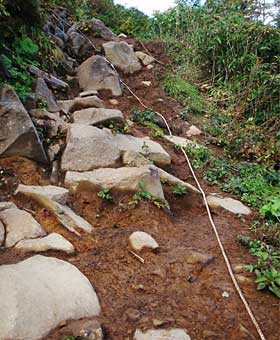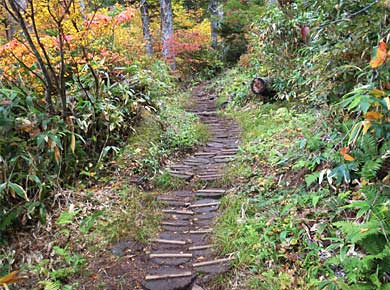 所々輪切りにした丸木が敷いてありますが↑、この道はだいぶ湿っぽい感じで、よく滑るので、滑り止めの横木まで付けて頂いて、整備は大変だったろうと思われます。
