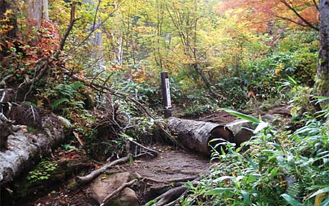 秋山林道を雑魚川(ざこがわ)沿いに魚野川との合流点「切明(きりあけ)」に出て、さらに北の小赤沢という集落から狭い林道を登り、苗場山三合目の駐車場に出ました→。