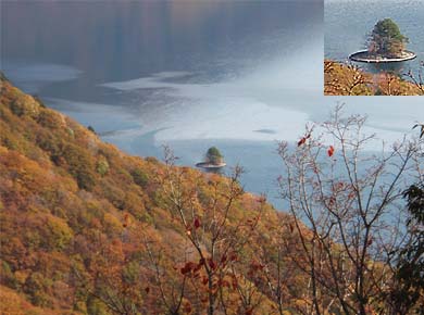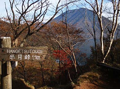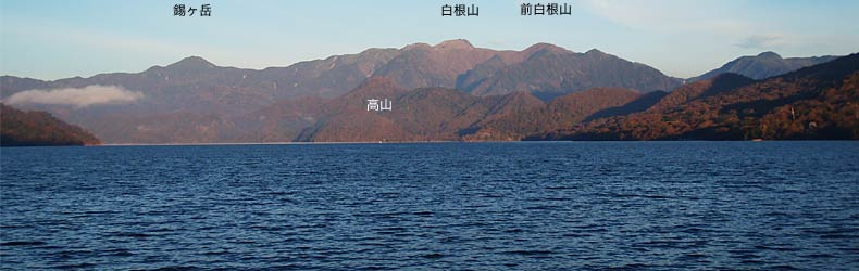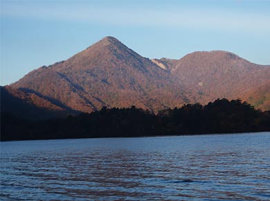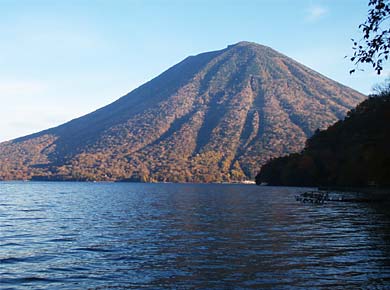 湖畔の道は狸窪(まみくぼ)まで一般車の通れない車道ですが、林の紅葉や西側の山並み↑、男体山↓なども見えて、退屈することはありません。↓白根山。まだ雪は無いようです。