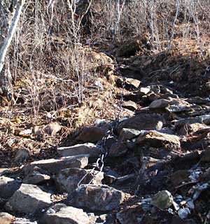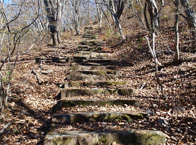 ↓峠の先から傾斜は急になって木や石の段が出てきました。見上げる山頂方向も更にとがってきました↓。 ![]() |