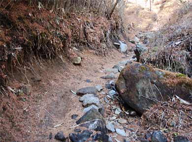 行き会った方の話では小学生の遠足にも使われるコースだそうで、からまつ林や涸れ沢沿いの道↓をのんびり歩きます。