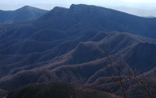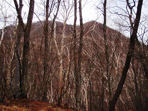 山は見る角度によって形が変わりますが、これも動物の背中を横から見ている形で、右側のピーク近くに登ると三角形に見えました。