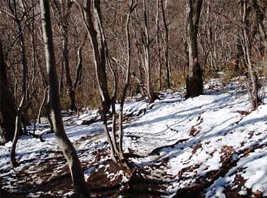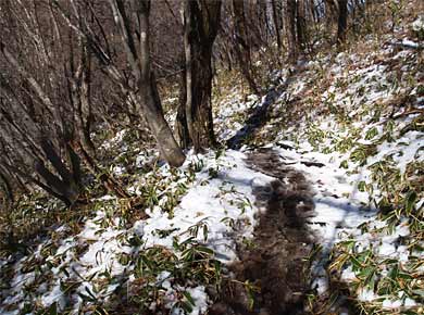 前日まで二日ばかり雨が降りましたが、この辺の高い所では雪だったようで、薄い残雪が見られました↑。