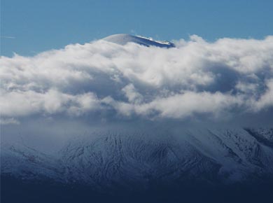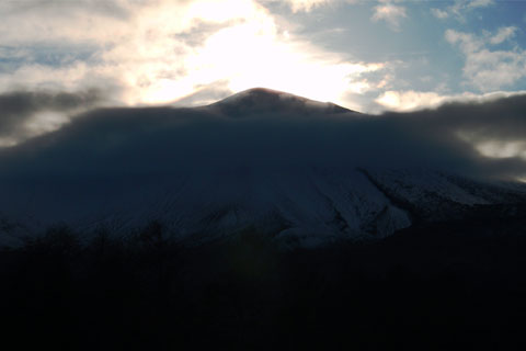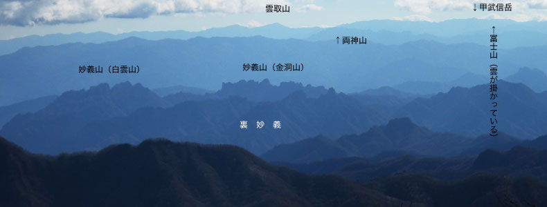 ↑手軽な山とは言っても、やはり山で、次第に傾斜が増して木の根の段差なども出てきます。昼に近くなって気温が上がり、雪がぐちゃぐちゃに溶けてきました(上右)。 だいぶ山頂に近づいて角度が変わり、獣の背中を前後から見る形で、三角形に見えてきました→。 ↓隣の鼻曲山(はなまがりやま)は前から林の枝越しに見えていましたが、林が切れてよく見えるようになりました。 こちら側から見ると、仰向けに寝た人の鼻と、後ろの山がその口まわりのようにも見えます。 |