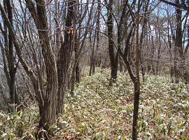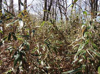 登山道にはいると、笹藪の道になり↓、笹にからむので杖が邪魔になってきます。