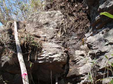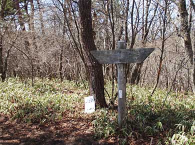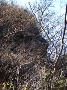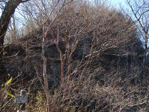 十分ほども歩くと、尾根上に大きな岩が幾つか並ぶ所があり、↓獅子岩という標柱が立っています。↑はその岩の脇を越える所で、往きは下りればいいのですが、良い足場がないので帰りは踏み台がほしいところです。