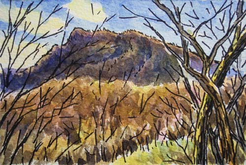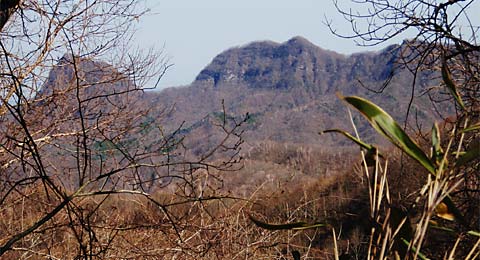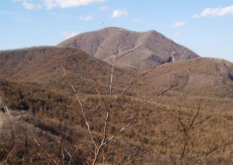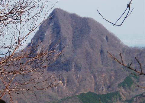 ←岩を過ぎて林の切れ目から見た隣の角落山(つのおちやま/左)と剣ノ峰。