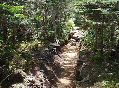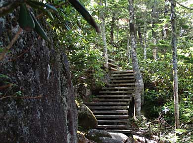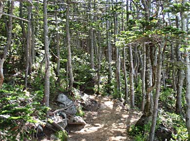 ↑それでも、時々階段や桟道がとぎれると、針葉樹林の少し湿ったような奥秩父の昔を思わせる道になります。