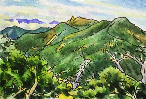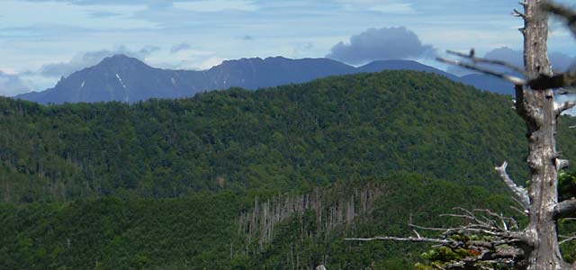 ←時々林の切れ目から遠景が見えることがありますが、このあたりで目立つ山は、やはり西隣の金峰山です。