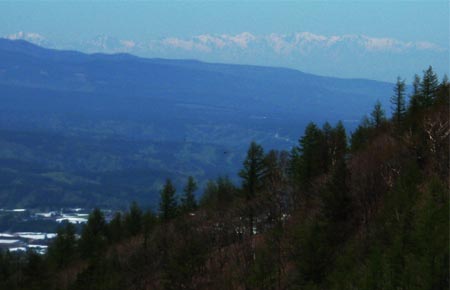 少し西寄りの南面の展望↑。 南東側は、高登谷山南峰の先に奥秩父西端の山並みが見られます↓。