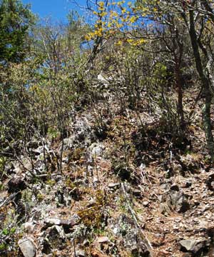 ↑南峰から少し下った天狗岩。こちら側からではそんなに高低差がありませんが、反対側に下りて見上げるとけっこう突き立って見えます(上右)。 天狗岩から見る高登谷山→。 ↓同じく八ヶ岳の右側に霞んで見える北アルプス。 南峰からの下りも岩屑のがらがらした直線的な下りで(下右)、すぐに別荘地に出ます。 |