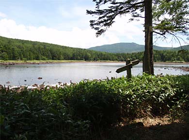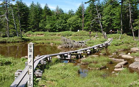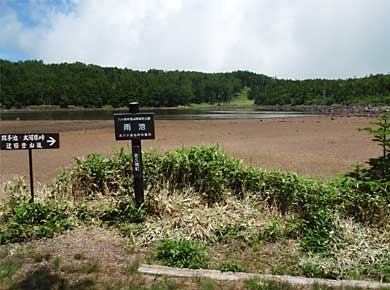 ↑雨池。赤茶色の平面はいつもは水面になっている所ですが、今年はだいぶ干上がっていました。雪が少なかったのかもしれません。池畔を右手に少し廻った登り口から雨池山への緩い登りになります↑。