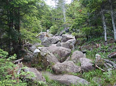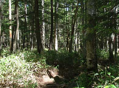 ↓ここから「北八ヶ岳の原生林」と紹介される、大きな石のゴツゴツしたシラビソの林の道を行きます。 周りが同じようなゴロ石なので、石についた乾いた泥の靴跡や、木に付けた赤テープなどに注意していないと、道の曲がる所で原生林の中に迷い込んでしまう事もあるかも知れません。