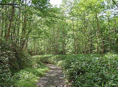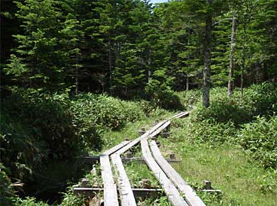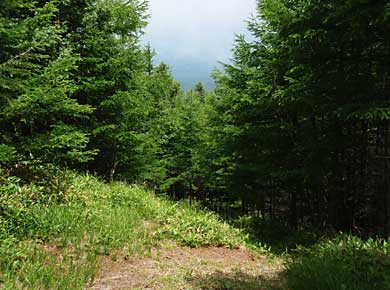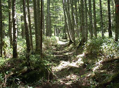 単調な林の中を40分ほども歩き、壊れかけた林道に出て少し行くと、また雨池への木道にはいります↑。