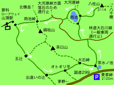 下左)雨池峠。ここからロープウェイ駅へは遊歩道が続きます。