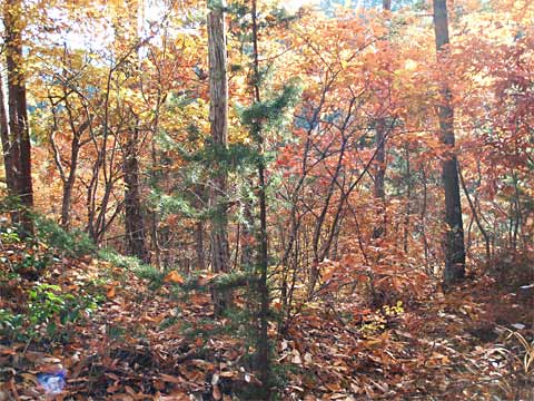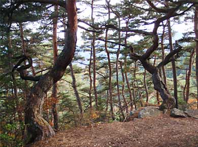 庭園で見るような枝振りの松など↑もあり、もしかして松茸が……と思ったら、「茸止山」の張り紙がありました(上右)。