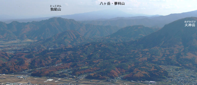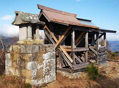 ![]() 南麓の青木村から見ると、ゆるやかな山の上に切り立った台形の山が乗っている形ですが、鳥居からは上の山にかかったようで、↑だいぶ急坂になってきました。 自然林の急斜面を行くと一旦小さな鞍部のような所に出て、すぐ東側の高みが山頂かと思ったら、それは細長い山頂の別の端で、西の端が最高所となっていました(↑右)。 |