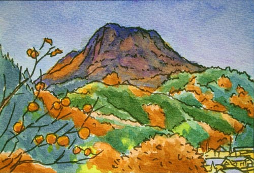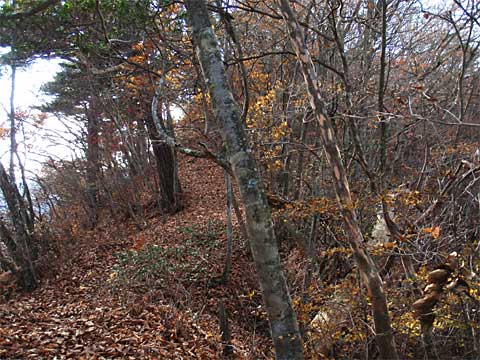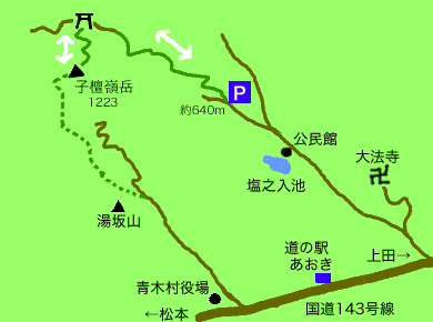 ↑地元の信仰の山らしく、山頂には祠が三つもあります。↑南の麓。大法寺の右上、松本街道からはいって来ました。左上が上田、右下が松本方向です。