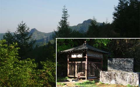 ぶどう峠と、そこから見た御座山(おぐらさん/右)→。