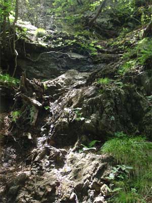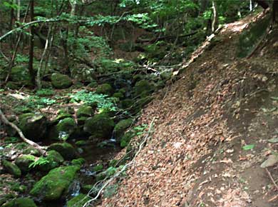 ↑ようやくたどり着いた登り口の住居附(すもうづく/看板の左が入口)。案内板の道を隔てた反対側にこの地区で最も奥の家があって、山頂からその屋根が見えました。↑作業林道を少し歩くと、沢沿いの細い山道になります↓。沢は枝分かれして細くなりながら地蔵峠の下まで続きます。